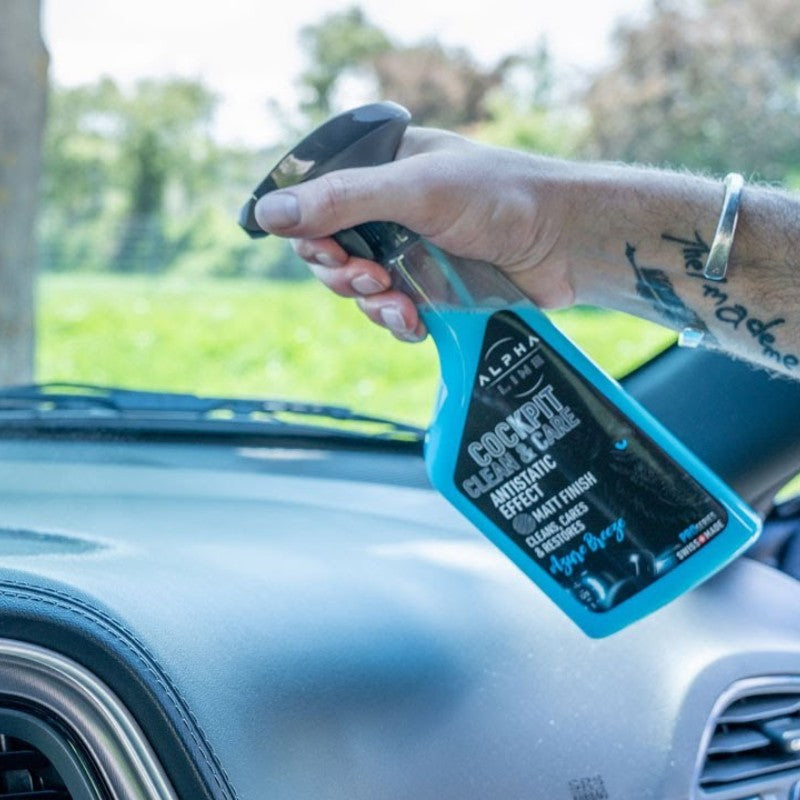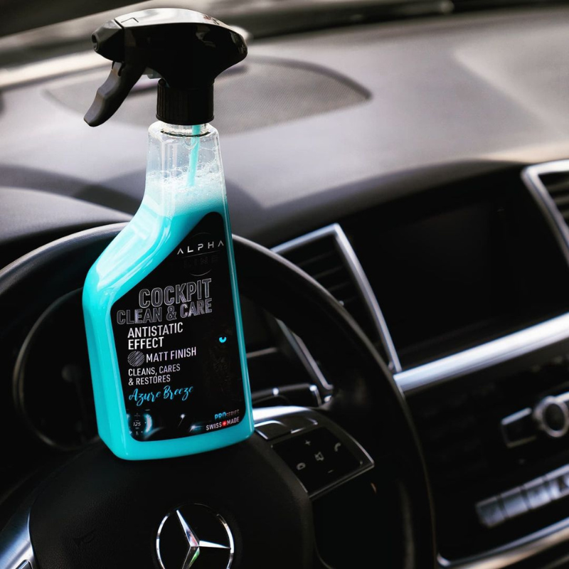 2. Produkt auftragen: Sprühe den Alpha Line Cockpitreiniger & Cockpitpflege 2 in 1 auf ein Mikrofasertuch oder direkt auf die zu reinigende Oberfläche.