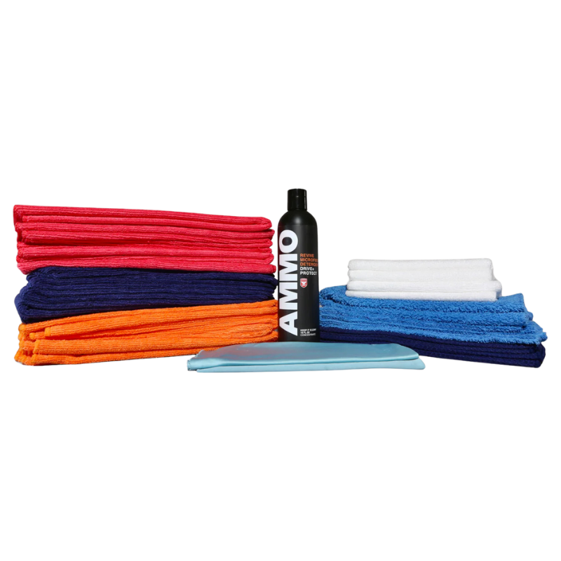 Contents: 1x Ammo Nyc Premium Microfiber Detergent 475ml, 1x Ammo Nyc Blue Microfiber Cloths 6-pack (35 x 60cm / 325-350 GSM) , 1x Ammo Nyc Red Microfiber Cloths 6-pack (35 x 60cm / 325-350 GSM), 1x Ammo Nyc Orange Microfiber Cloths 6-pack (35 x 60cm / 325-350 GSM), 1x Ammo Nyc Microfiber Polishing Cloths 4-pack ( 300+GSM), 1x Ammo Nyc Ultra Plush Microfiber Wash Cloths 3-pack (40 x 60cm / 380-400 GSM), 1x Ammo Nyc Waffle Weave Glass Cloth 2-pack (40 x 60cm) and 1x Ammo Nyc Glass Polishing Cloth for Finishing 2-pack (50 x 50cm)